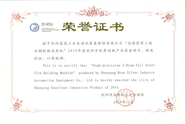 藍(lán)英集團(tuán)沈陽(yáng)公司研發(fā)的“高精度型三鼓全鋼輪胎成型機(jī)”榮獲“2019年度沈陽(yáng)市優(yōu)秀創(chuàng)新產(chǎn)品”獎(jiǎng)。