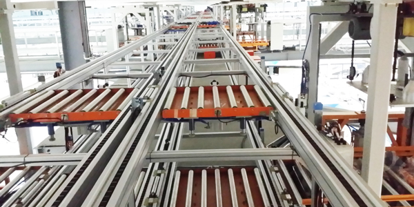 接取成型機(jī)機(jī)械手抓取的胎胚,通過升降機(jī)輸送到空中,由倍速鏈輸送到噴涂區(qū),輔以龍門機(jī)械手完成內(nèi)噴涂,然后烘干,由堆垛機(jī)入庫儲存。不需要噴涂的胎坯直接入庫。