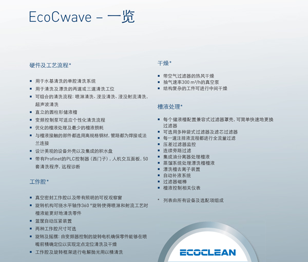 · 由于系統(tǒng)提供了兩種不同的工作腔尺寸可選,您可以更好地規(guī)劃您的清洗筐,因此單位清洗成本可降低。Ecoclean為您的EcoCWave提供了大量的選配項(xiàng),可根據(jù)您的需求進(jìn)行個(gè)性化選擇。