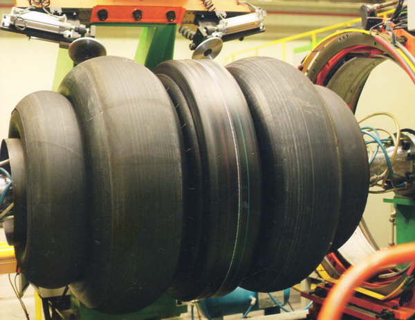 本裝置由左右反包、助推膠囊組合充氣完成反包定型,胎側(cè)反包拉伸均勻一致,胎側(cè)高度一致性好,胎側(cè)反包氣泡少,胎胚外形均勻?qū)ΨQ。 成品輪胎胎側(cè)無側(cè)鼓,有效保證輪胎動平衡指標(biāo)值的提升。